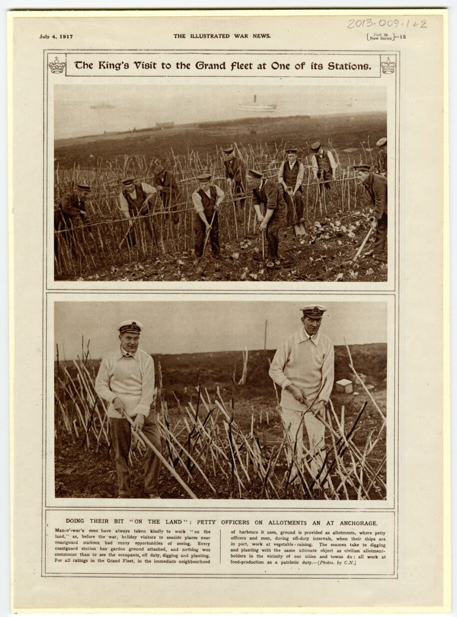 During wartime huge numbers of soldiers and sailors must be fed. Behind the lines soldiers planted vast fields of vegetable crops. Here we see the allotments made beside the harbour of the Grand Fleet, with Petty Officers at work.