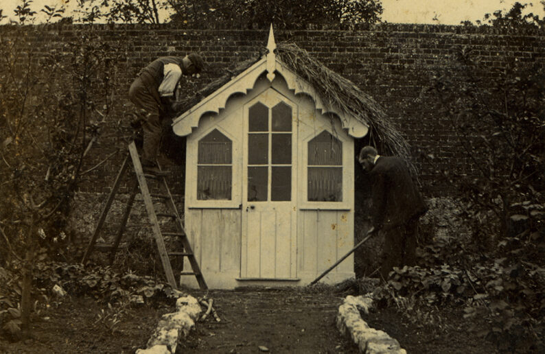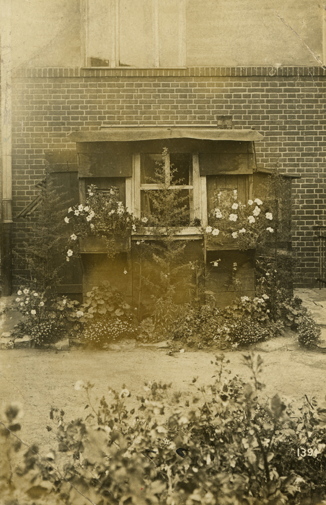 Photograph of a garden created by World War I British civilian detainees at the Rhuleben Camp near Berlin in Germany. Dated 1917 and annotated ‘Hut my Father built with Red Cross Boxes’ and ‘with best love, Mathilde’. From a series of photographs taken at the camp by Frank Hamilton Narraway, a professor at a German university at the outbreak of war, which led to his internment, although married to Mathilde who was German. Gift of Ann Narraway, granddaughter of Frank & Mathilde.