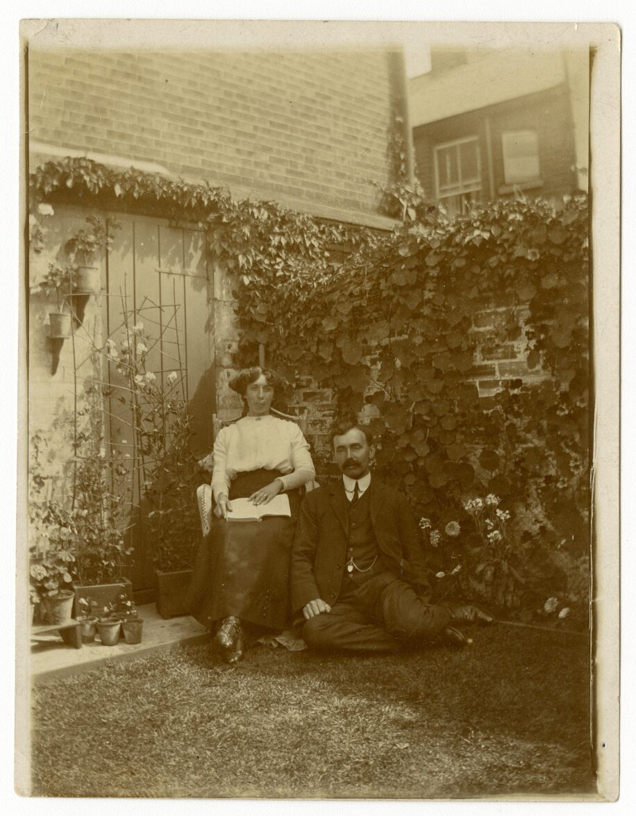 A couple pose seated in a shaded corner of a back garden in Cobholm, Norfolk. They are surrounded with climbing plants and a well kept lawn.