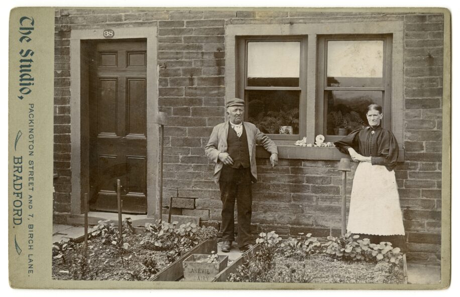 In a front garden on Manchester Road, Bradford, a man and woman pose by two raised beds and a window lined with ferns. This photograph was taken by E. Cole Keighley in about 1900.