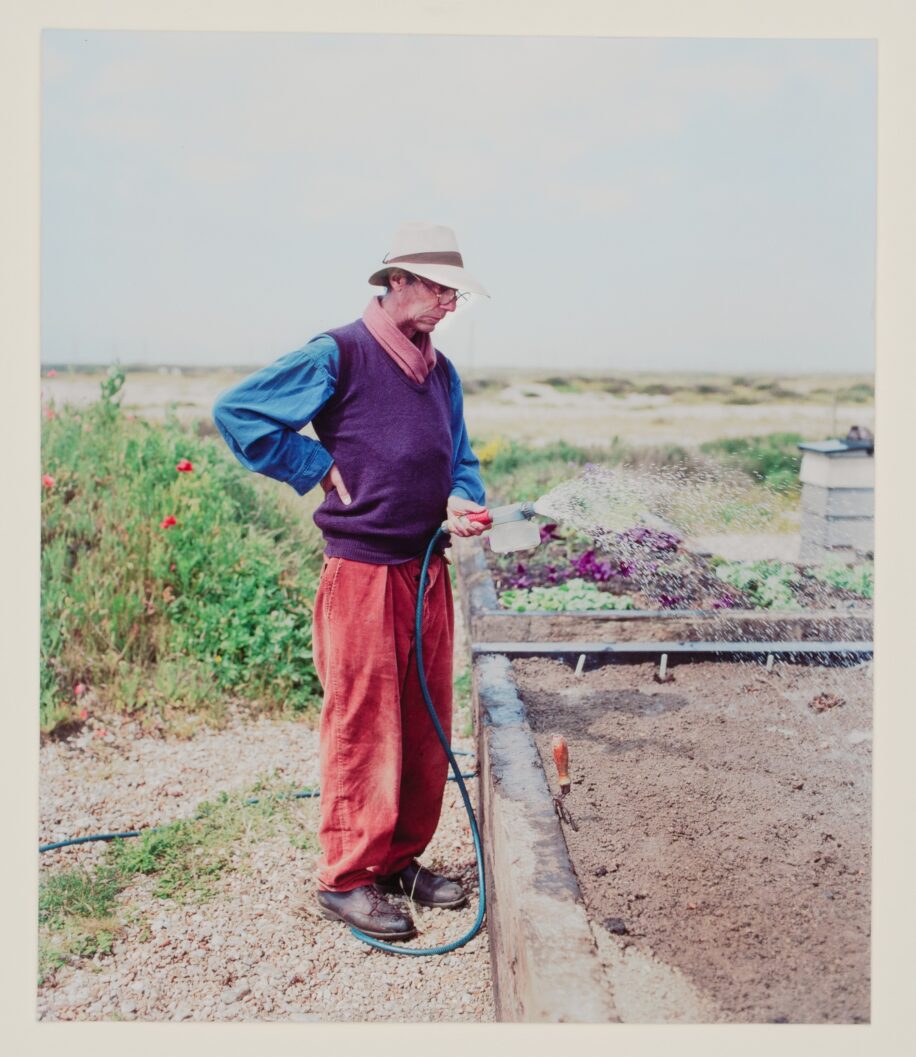 In the 1980s, Jarman, a painter and film-maker, bought a derelict fisherman’s hut on Dungeness, a shingle beach overlooked menacingly by a nuclear power station. This became his home Prospect Cottage and, despite a plethora of barriers to successfully growing plants here, he threw himself in to gardening the surrounding land. Jarman made a garden without boundaries that combined plants with sculptures made of found objects such as stones, driftwood and the debris of old fishing boats. The garden is a work of art reflecting Jarman’s life. From 1986 he was living with HIV and died from an AIDS related illness in 1994. He described his garden and gardening as an act of love and grief, as he lost close friends to the disease: ‘a memorial, each circular bed and dial a true lover’s knot’. Jarman used the garden at Prospect Cottage and surrounding landscape for scenes in his films The Last of England (1987) and The Garden (1990). This photograph taken by Howard Sooley shows Jarman watering a raised bed with a bank of plants and bee skep behind. Jarman created the garden by hand, digging into the shingle, building beds and banks to help with the difficult growing conditions.