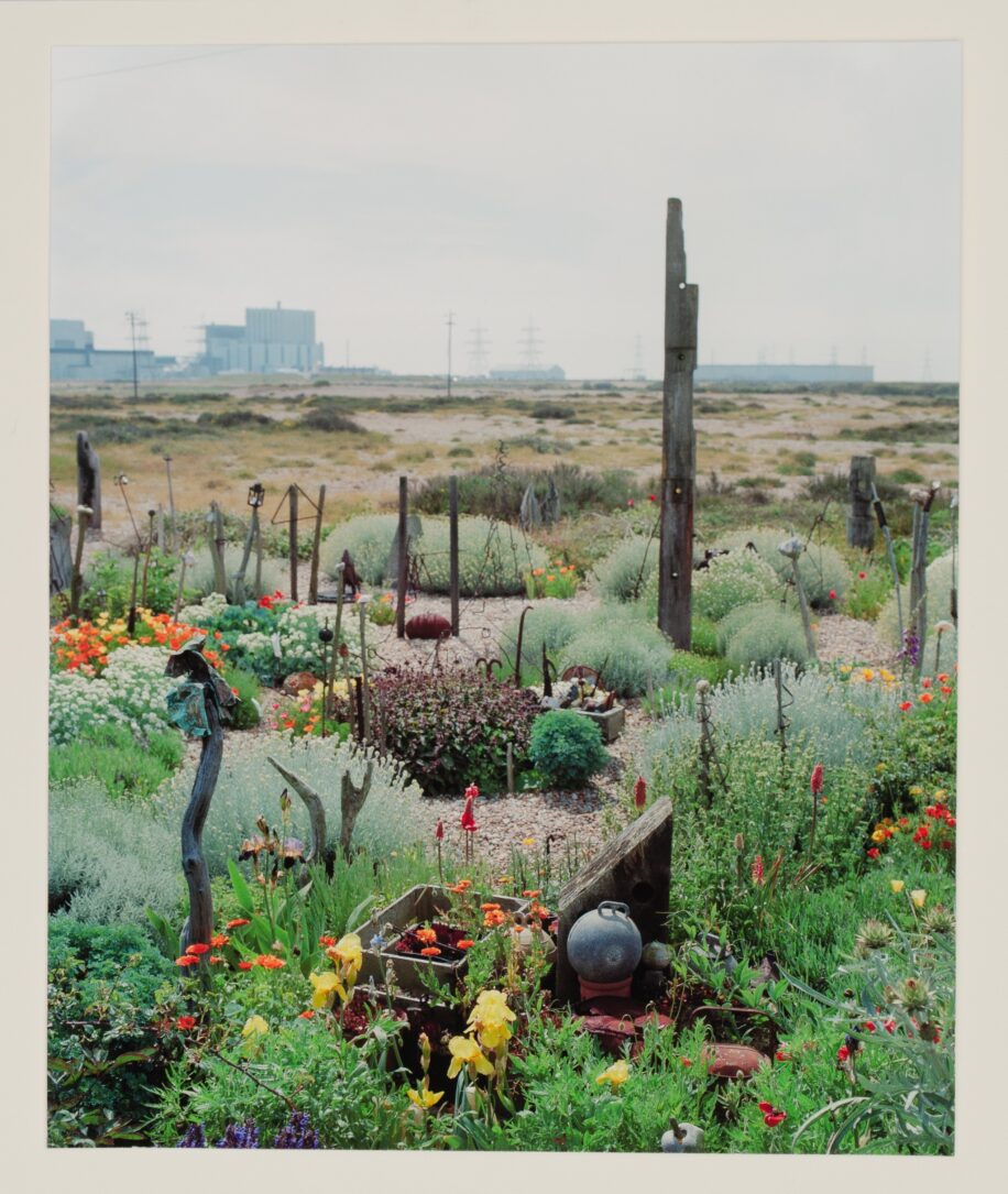 In the 1980s, Jarman, a painter and film-maker, bought a derelict fisherman’s hut on Dungeness, a shingle beach overlooked menacingly by a nuclear power station. This became his home Prospect Cottage and, despite a plethora of barriers to successfully growing plants here, he threw himself in to gardening the surrounding land. Jarman made a garden without boundaries that combined plants with sculptures made of found objects such as stones, driftwood and the debris of old fishing boats. The garden is a work of art reflecting Jarman’s life. From 1986 he was living with HIV and died from an AIDS related illness in 1994. He described his garden and gardening as an act of love and grief, as he lost close friends to the disease: ‘a memorial, each circular bed and dial a true lover’s knot’. Jarman used the garden at Prospect Cottage and surrounding landscape for scenes in his films The Last of England (1987) and The Garden (1990). This photograph taken by Howard Sooley shows the planting at Prospect Cottage and its relationship with Jarman’s sculptures. The shingle landscape and nuclear power station beyond are undivided from the garden. In his book ‘Modern Nature’ Jarman writes ‘My garden’s boundaries are the horizon’.