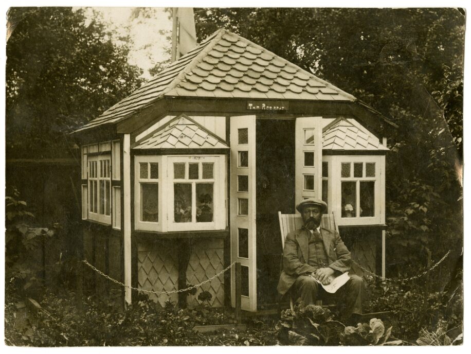 Sitting on a deckchair, a man poses outside the doors of a summerhouse labelled ‘The Retreat’. He is surrounded by bard-edged beds with flowers and vegetables.