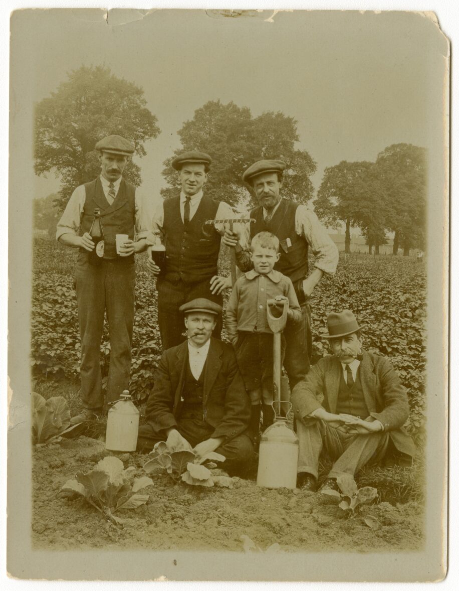 Kegs of beer and garden tools in hand, five men and a young boy pose in plot of growing vegetables.