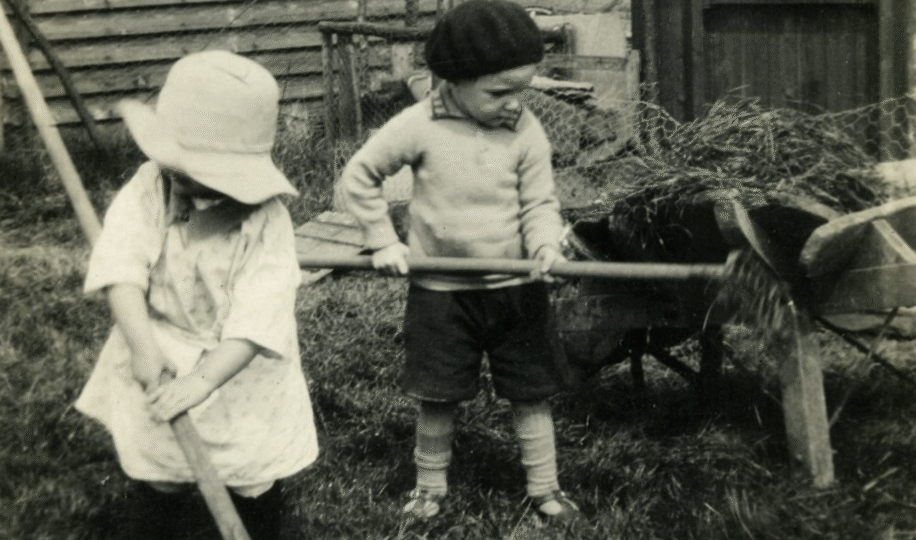 Photograph of two young children gardening on allotment., both with rakes on grass next to a wooden wheelbarrow adjacent to sheds. Undated, but probably c.1935.