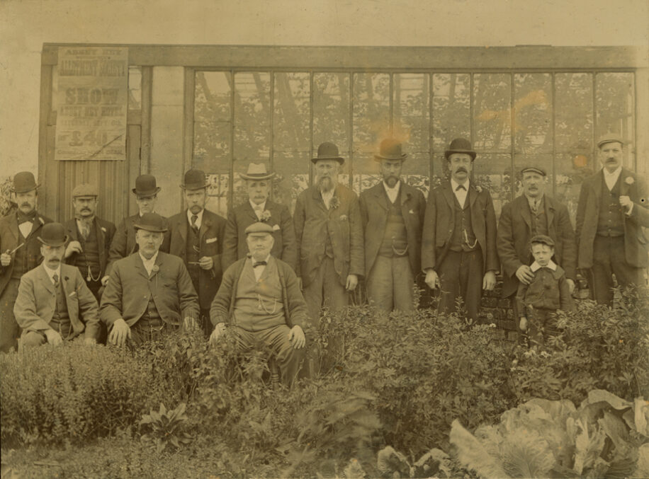 Photograph pasted on card showing a group of men and one boy, most with buttonholes, posing before a lean-to glasshouse with assorted planting and vegetables in the foreground. Notice on door, ‘Abbey Hey Working Men’s Allotment Society’, now Greater Manchester, and dated Saturday, 6th September Saturday (so probably 1902).