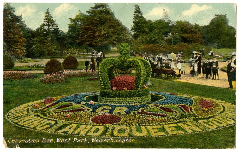 This postcard, posted in 1912, shows a coronation bed in Westpark, Wolverhampton. The bed has a large crown of flowers and the words “King and Queen” around it in. This is an example of carpet bedding, the planting of blooming plants close together into a clear design. The practice of carpet bedding began in the Victoria era and was popular in the early 20th century. These public displays attracted people into town parks and were used to cultivate a sense of civic pride, showcasing written messages and emblems, as well as new ideas.