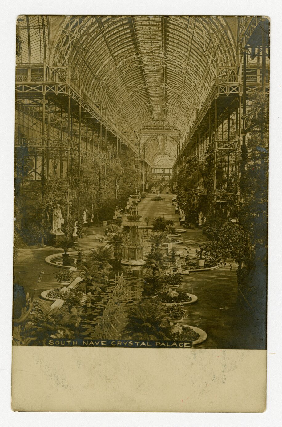 This postcard from c.1905 shows the central lily pool of the Crystal Palace, lined with fountains, urns and statues. At over 1848 feet long and 408 wide, the palace had two huge towers and fountains with over 11,000 jets. The palace was destroyed in a fire on the night of November 30th 1936.