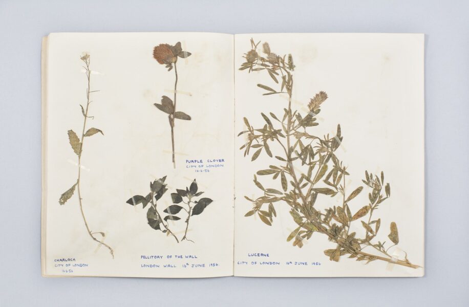 This scrapbook was used by Jane Lindsay while still a schoolgirl in London to record and preserve wildflowers picked from bombsites in the City of London. Flowering plants include purple toadflax, pellitory of the wall, and lucerne. As a child Jane Lindsay was encouraged to look at flowers by her mother, who had studied botany. By the time she started school she knew the names of most of the wild flowers growing close to her house. In her teens she joined a naturalist group organised through the Young Elizabethan magazine and led by Richard Fitter, a leading figure in the urban botany which flourished in post-war Britain. These flowers were collected from the bombsites on which the Barbican would later be built, and which she remembers as ‘a wild, open space, full of birds and wild flowers… and remnants of the old Roman walls’. One phenomenon of the Blitz was the efflorescence of spontenaous flora in the bombed rubble. The botanist Edward Lousley estimated that before the war no more than 20 flower species grew in the City of London. By 1944, over 100 could be found. These sudden meadows became symbolic of rebirth and hope, so that just before VE Day The Times featured as a lead news story a lecture by the botanist E J Salisbury, describing how ‘wildflowers had spread over the bombsites: rosebay willowherb, coltsfoot, groundsel, Oxford ragwort, Canadian fleabane and thornapple, Thanet cress’.