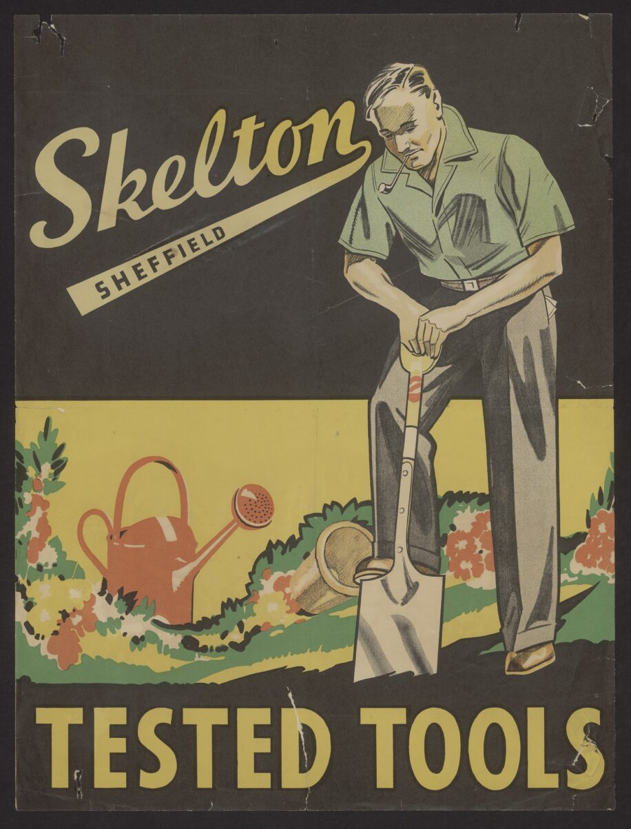 A brightly coloured printed poster dating from around 1935 – 1950, advertising ‘Tested Tools’ made by Skelton of Sheffield. The dominant image is of a casually dressed man who is smoking a pipe while digging the garden with a spade. Behind him are a red watering can, a flowerpot and a variety of flowers with a yellow and black background. Charles Thomas Skelton, later Sir Charles, founded the company bearing his name in Sheffield in 1855 making spades, shovels, picks and other tools. From the 1870s the company operated from the Sheafbank Works where garden tools were also produced. By the 1960s following various mergers the firm became part of Spear and Jackson. Purchased in 2010 under the Heritage Lottery Fund’s Collecting Cultures scheme.