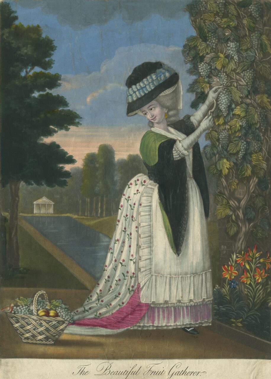 This print, titled ‘The Beautiful Fruit Gatherer’ dates from around 1790. It was produced using the mezzotint method popular at this time, where the copper plate surface is ground to produce a rough surface. Areas are then scraped and polished to produce light and dark tones. The colours of this print are particularly bright and vibrant. The scene depicts a young woman fashionably dressed in an ornate dress and bonnet picking grapes from a vine. The basket on the ground beside her is filled with grapes, figs and peaches. In the background there is a man-made rectangular lake with a small temple beyond. The print is trimmed below the caption, but was probably printed for Sayer and Bennett who were map and printsellers based in Fleet Street in London.