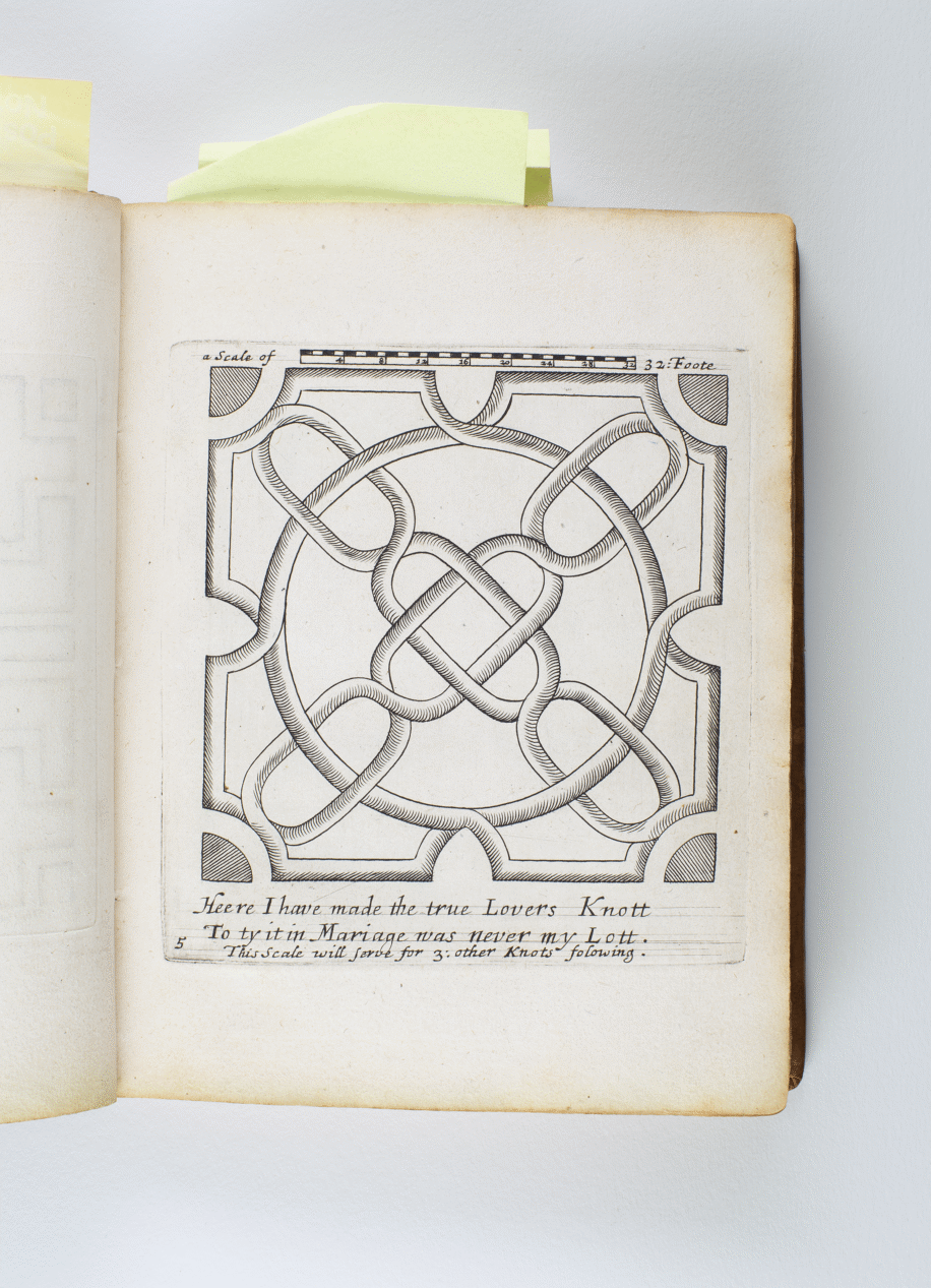 ‘I long to lay my hands on a copy’, wrote the garden designer Rosemary Verey of this manual to the 17th century garden, ‘as we have used his design of the True Lover’s Knot for our knot garden’. This volume, which she did acquire and which came to the Museum at the sale of her library in December last year, is a remnant of her passion for historic garden books, a passion which in turn can be seen in her designs. This copy of the The Compleat Gardener’s Practice even includes the yellow post-it note which Verey used to mark the knot design which inspired her own renowned garden at her home, Barnsley House. In all, the book contains 30 plates depicting ‘a variety of knots for the beautifying of the garden’, and addresses the methods and plants proposed for the ‘garden of pleasure, the physical garden and the kitchin garden’. Stephen Blake was the gardener to William Ouglander, a Member of Parliament; however, very little else is known about him. The knot designs in this book are particularly interesting for what they reveal about the development of knot patterns in gardening books and pattern books of the time. The book includes illustrations of parterres de broderie which came into fashion at the turn of the 17th century, marking the epitome of a phenomenon which saw designs replicated in embroidery and textiles, as well as in garden design. Rosemary Verey (1918–2001) took the garden world by storm in middle-age, and although her work was surprisingly diverse she is best known for the revival of period styles of gardening. The True Lover’s Knot, which she adapted from one of the plates in this book, emulates the more traditional styles of the Elizabethan period. The design is accompanied by an inscription by Blake: ‘Here I have made the true Lovers Knott, To Try it in Mariage was never my Lott’. Along with the laburnum walk and her kitchen garden, Barnsley House was well known for the knot garden which Verey planted there. Purchased with the assistance of the ACE/V&A Purchase Grant Fund, the Friends of the National Libraries, Peter Nahum and Barbara Robinson.
