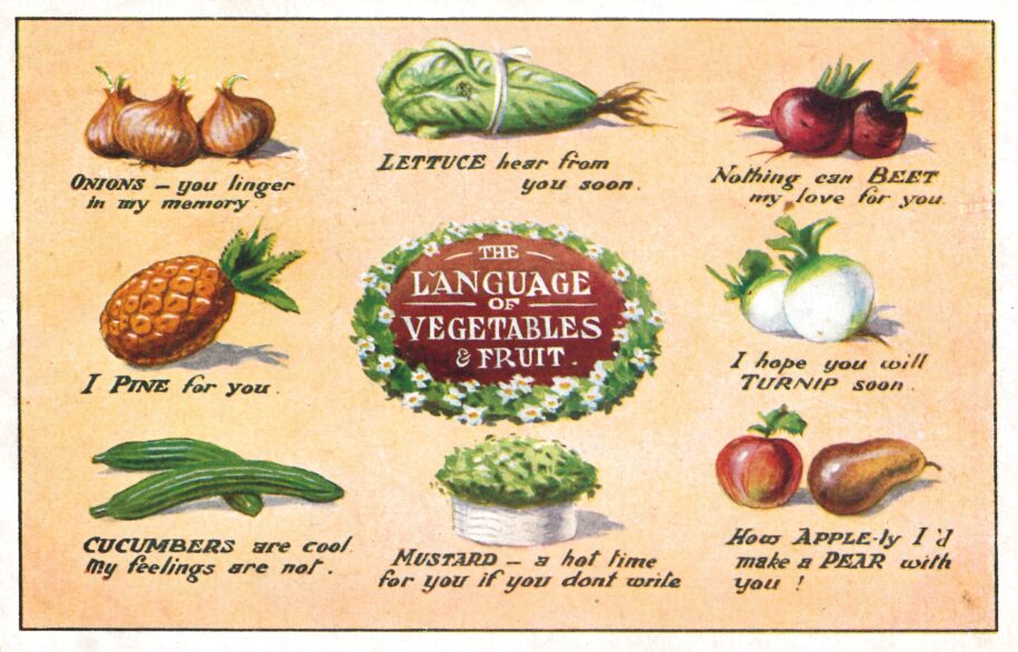 This comic postcard titled ‘The language of Vegetables and Fruit’ shows eight fruit and vegetables with symbolic love related meanings. The postcard follows ‘The Language of Flowers’ idea where each variety of flower conveyed a sentiment on Victorian cards. Similar postcards decoding ‘The Language of Flowers’ can be found, for example this postcard in our collection. ‘The Language of Vegetables and Fruit’ postcard was published by Inter-Art Co in 1921.