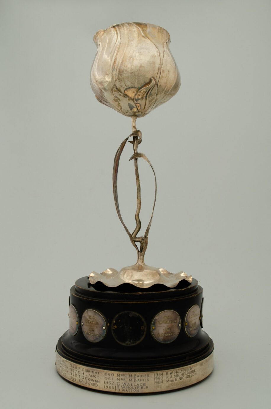 This is a beautiful tulip-shaped silver cup with a delicate intertwined leaves and stem for support from a fluted base. It was awarded to individuals between 1912 and 1987; the names of winners 1912-1952 were engraved on circular silver plaques attached to the wooden base. Those who won the trophy between 1953 and 1987 had their names engraved on a silver collar encircling the base. It was part of the LCC and subsequently GLC Horticultural Society awards, perhaps for tulips, which were donated to the Garden Museum in 1988 when the GLC was disbanded.