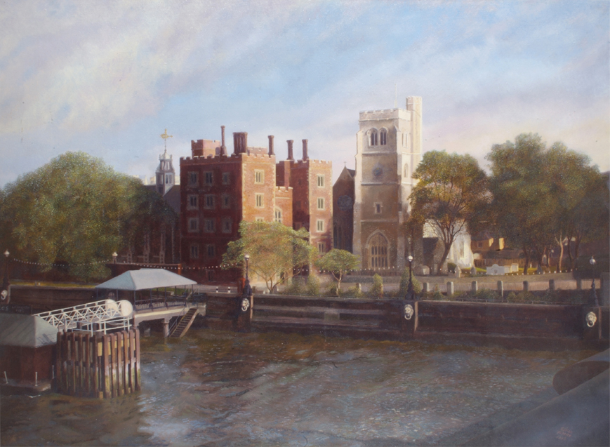 ‘View from Lambeth Bridge’ by Gillian Whaite showing the Garden Museum (formerly St Mary-at-Lambeth) and Lambeth Palace. An oil on canvas dated 1989. Gift of Sonia Copland.