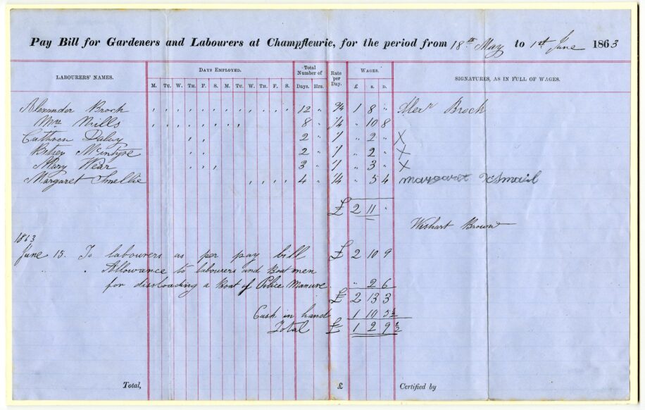 The bill for Champfleurie records day wages paid to female labourers, and the unloading of a barge of manure from police horses.
