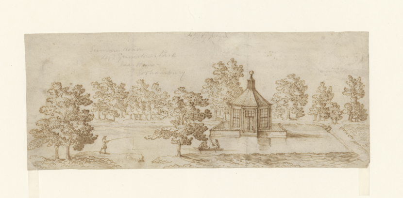 This drawing was acquired to illustrate the transition in the style of garden design from formal to informal in the early 18th century. The garden itself is yet to be identified, but we see a octagonal pavilion as the centrepiece of a water garden. A later hand has written ‘Gorhambury?’ in pencil but it has no resemblance to the actuality of Francis Bacon’s garden in Hertfordshire. Purchased through the HLF Collecting Cultures grant.
