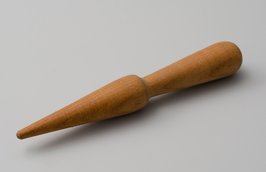 A turned wood dibber used for creating planting holes, mostly for bulbs.