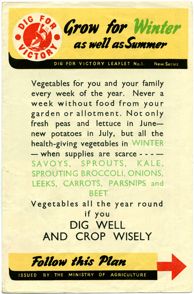 World War II ‘Dig For Victory’ leaflet No.1, Grow for Winter as Well as Summer, giving vegetable cultivation details for gardens or allotments. Issued by Ministry of Agriculture, St Anne’s, Lancashire, c.1940. Gift of David Mobbs.