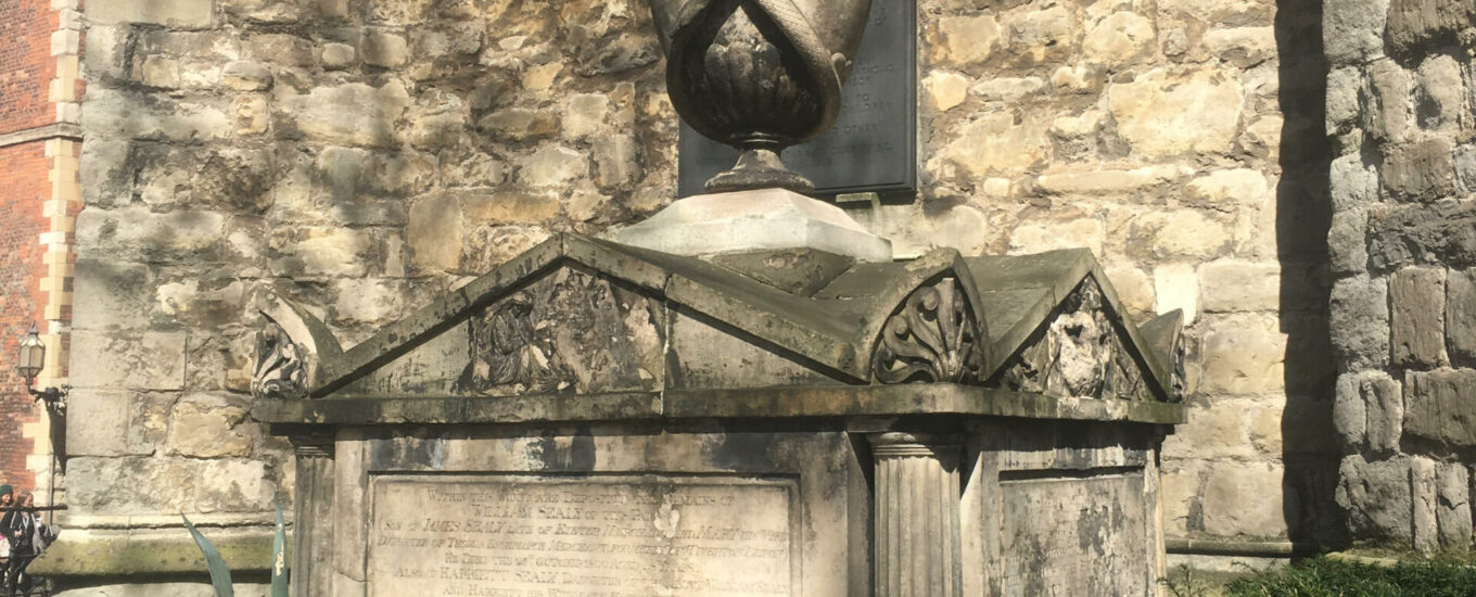 And it is at risk owing to decades of traffic pollution: the plaques are as black and fragile as cold, burnt biscuits. Under the pediments, the chemical deposits have collected in fistfuls. Now that we have finished the restoration of the church – and please note the lamps at the gate-posts have been lit again, thanks to The Heritage of London Trust – the consolidation of the Sealy tomb is our priority. The remarkable Pilgrim Trust have funded a study by Cliveden Conservation, whose expertise in Coade includes restoring the one-armed Druid in Priory Park, Chichester. The cost to preserve the Sealy tomb without further loss of sculpture is £14,000 and we have allocated a generous donation left to us in a Will of £3,000 from a Friend (whenever we receive a legacy we try to put it towards something of lasting value to the heritage we care for). For the remainder we are applying to architectural conservation charities. But even in its blackened state, the tomb of the Sealy family is a handsome thing: please look next time you visit.