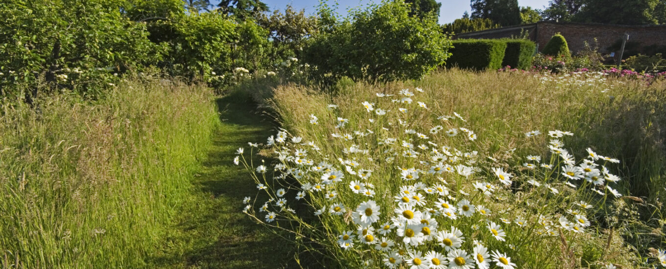 White Oxeye daisies and grasses line a mown path in the Orchard meadow at Greys Court, Henley-on-Thames, Oxfordshire.
