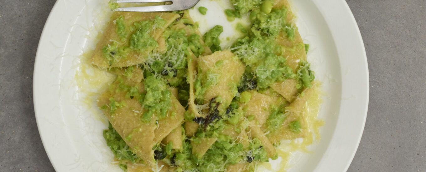 In all its forms it is the ultimate food of satisfaction, food that makes you nod your head in agreement; with its basic and simple charm. Gratification on a plate. On the menu at the restaurant we make our pasta fresh, in various shapes and sizes depending on the sauce. If you have a pasta machine at home then definitely give it a go, if you have the time. Personally, I find it a satisfying, almost therapeutic process; give yourself the time and the space to make it an activity, a project that you are looking forward to doing. It has to be said that it is less therapeutic and fun at work when you have to roll and cut 25 portions of pasta at 11 am, whilst trying to keep an eye on three other jobs. Fear not though, if you don’t have a pasta machine or the energy or time to make fresh pasta, then dried pasta is fine. Just make sure that you that you get your hands on some that is good quality, preferably one with a matte, slightly rough surface. It will encourage the sauce to cling to it. You will definitely notice the difference. The sauce here is really straightforward. It sings all of the high notes of those early summer weeks, lazy days and hazy nights, energy and frenzy abound – a good plate of pasta for your lunch, sitting outside, in good company, all washed down with wine; good white wine. You can picture the scene, right? This particular shape of pasta is called maltagliati, which translates as ‘badly cut’. They are little irregular shapes and sizes, cut or torn away from the main sheet. It’s a fun shape and one that, for some reason, works especially well for this dish. But if you prefer a different shape of pasta then by all means go for it. Ideally, the pasta dough wants to be made the day before it is going to be eaten, but at least 6 hours before. It needs a rest after all that kneading. To make the dough, mix the flour and semolina together in a bowl. In a separate bowl whisk the eggs together thoroughly. Make a well in the middle of the flour and pour the eggs in a little at a time. After adding each splash of egg you need to incorporate some of the flour, then add more egg and incorporate more flour and continue in this rhythm until all the egg and flour are incorporated together. Then tip it out onto a clean work surface and begin to knead the dough. It should feel quite dry and require a fair amount of effort to knead. Knead for about 5 minutes, basically until all the flour and egg are well combined and the dough is consistently yellow in colour. Wrap it in cling film and leave it in the fridge overnight. The following day, when you come to roll it, you want it to be room temperature, so get it out of the fridge at least a couple of hours ahead of time. Meanwhile, for the sauce, peel and dice the shallot and slice the garlic cloves. In a suitable pan, add the shallots, garlic, a good glug of olive oil, and a pinch of salt and let them soften slowly on low heat, you want to avoid any colour, so go gently and stir regularly. Once they have softened add the peas and a splash of water, turn the heat up and cover with a lid. Cook like this for 2 minutes then take the pan off the heat and carefully transfer the softened peas to a food processor. To this add the zest and juice of the lemon, the grated pecorino, and three twists of black pepper. Pulse together, in short bursts, until you have something that resembles a loose pesto (for me, slightly too chunky is better than too smooth). If it is looking a little dry then add a touch of water. Check for seasoning and adjust the salt, pepper, and lemon if necessary. Back to the pasta. Bring a pan of well seasoned water to a boil (people say that it should be as salty as the sea). Before beginning to roll the pasta, make sure you have both ‘00’ flour and semolina to hand. On a lightly dusted surface, use a rolling pin to roll out the pasta dough until it is thin enough to fit into your pasta machine. The pasta machine that I am used to using has a dial to adjust the thickness that goes from 1 to 10. On this machine, I begin rolling the pasta through on 10 (the widest setting), passing it through twice, and then twice at 8. At this point, I fold the dough. Taking the dough from one end and folding it into the middle and then folding the other end over the top of it. Repeat this step until the dough has been folded three times. This process of folding helps to build the glutens in the dough and leaves you with pasta that has a great texture. After the third fold of the dough, you can pass it twice through all the even numbers on the dial until number 4 – if at any point the dough is getting stuck or feels a little wet, then give it a dusting with the flour. It should then go through twice at 3 and twice at 2, before dusting with some semolina, just to prevent any sticking. At this point you are ready to cut or tear the pasta; strips, squares, triangles, or rhombuses – have fun with it. We are nearly there.