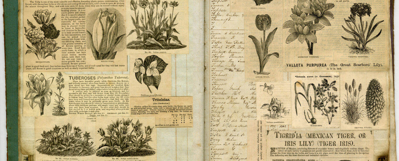 Anthony Elphick was the fifth generation of his family to run the Elphick’s business, and in 2003 he offered to donate their archive to the Museum. One of the items in the collection was a very old and tatty scrapbook titled Illustrations of Bulbs, Flowers, Roots Etc.