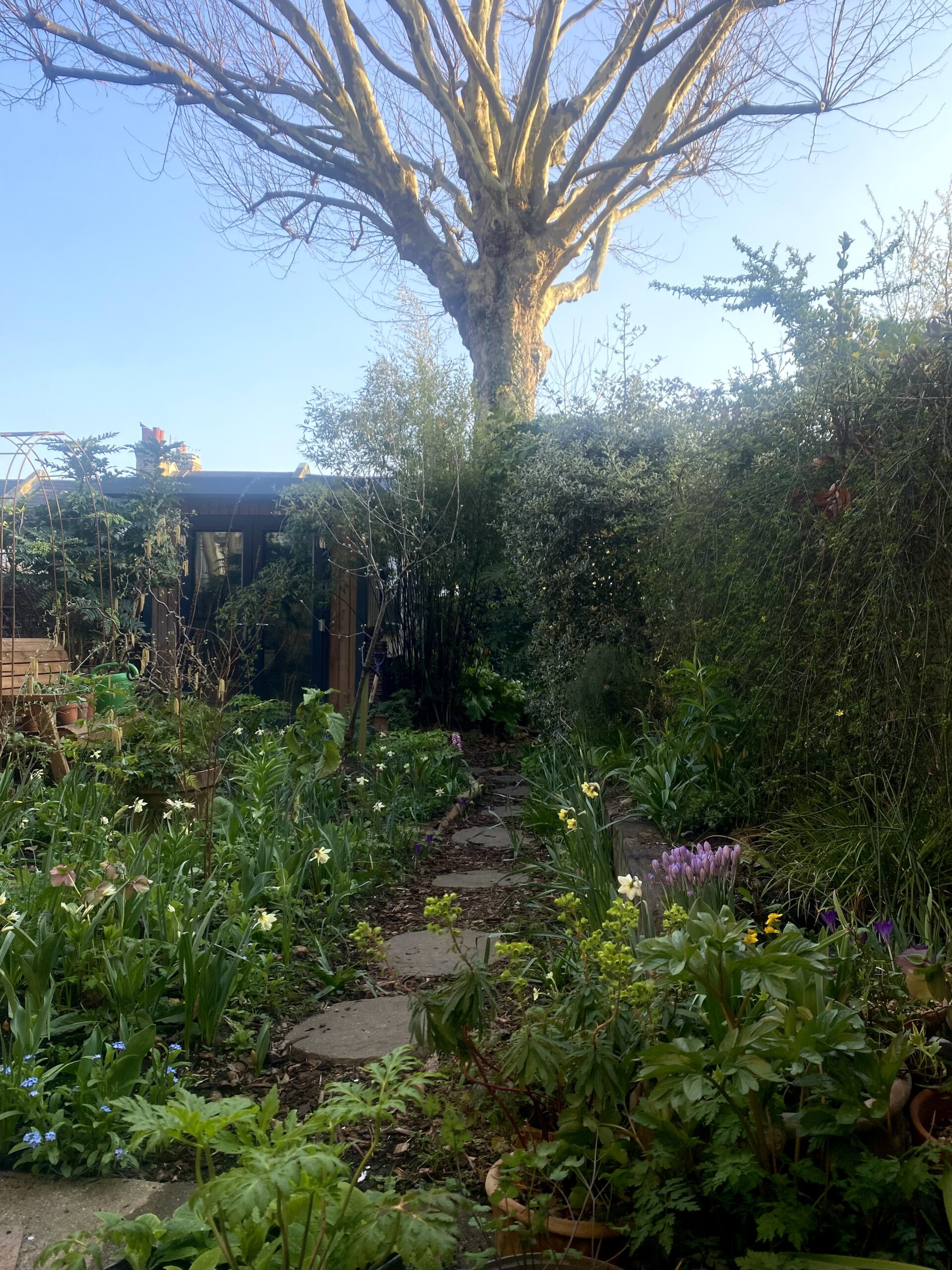 However, my real love is for shady woodland plants, so I was delighted to find that the bottom half of the garden is under the shade of a plane tree. Here, I planted some of my favourite woodland ephemerals – erythroniums, cardamine, uvularia and anemones.