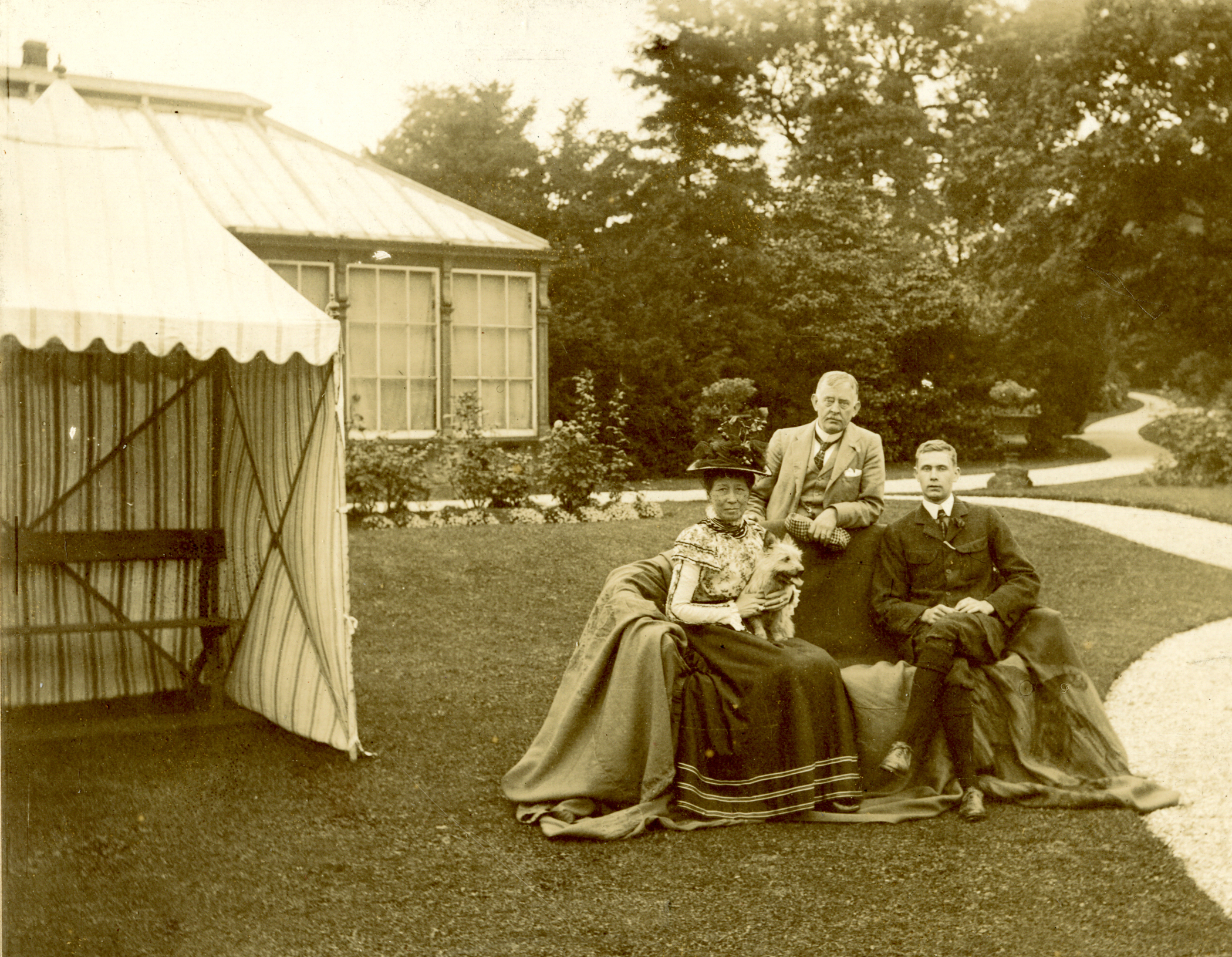Small tents and shaded awnings remained popular into the 20th century. A photograph in the collection of Captain Webb and his family dating from 1905 depicts them in their garden next to a small striped tent with a bench placed beneath it. The awning is supported by a metal framework and the fabric is decorated with the distinctive striped pattern of ticking fabric.