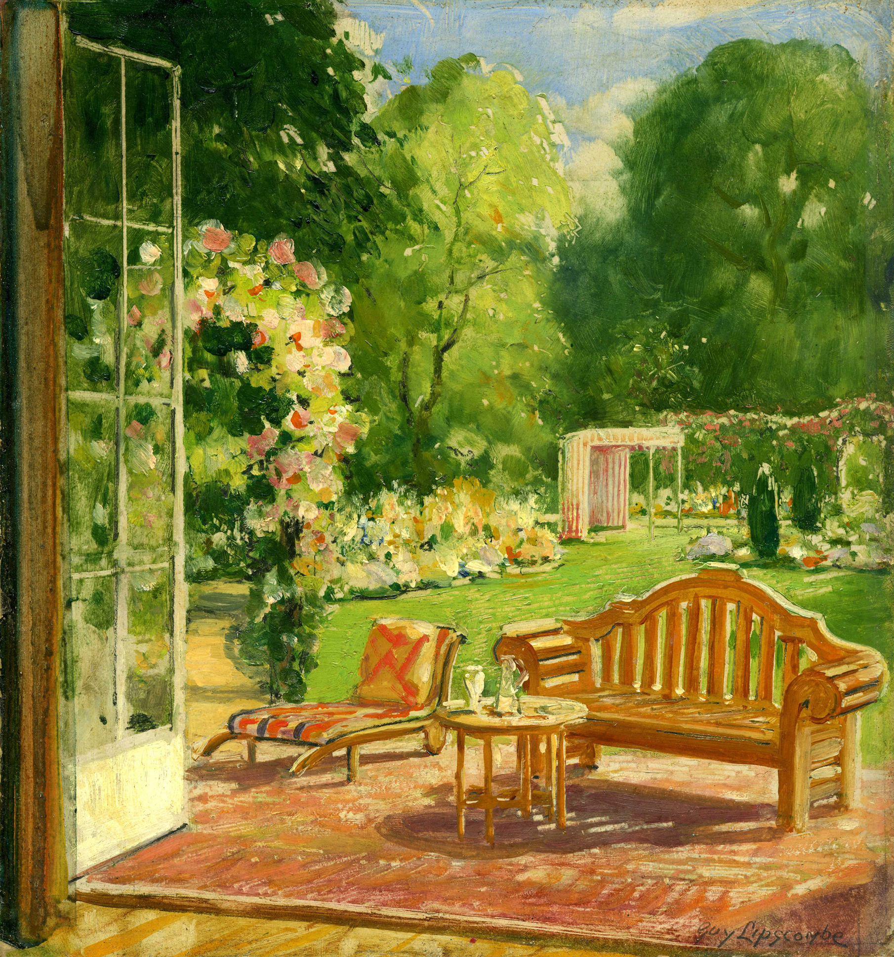 In ‘A Garden in Summer’ artist Guy Lipscombe illustrates a stylish garden with Lutyens style bench, wheeled recliner and a table with refreshments. The scene is enhanced with decorative rose arbor and an elegant striped tent. The decorative and useful garden awning and tent may have long been superseded by the humble garden parasol.