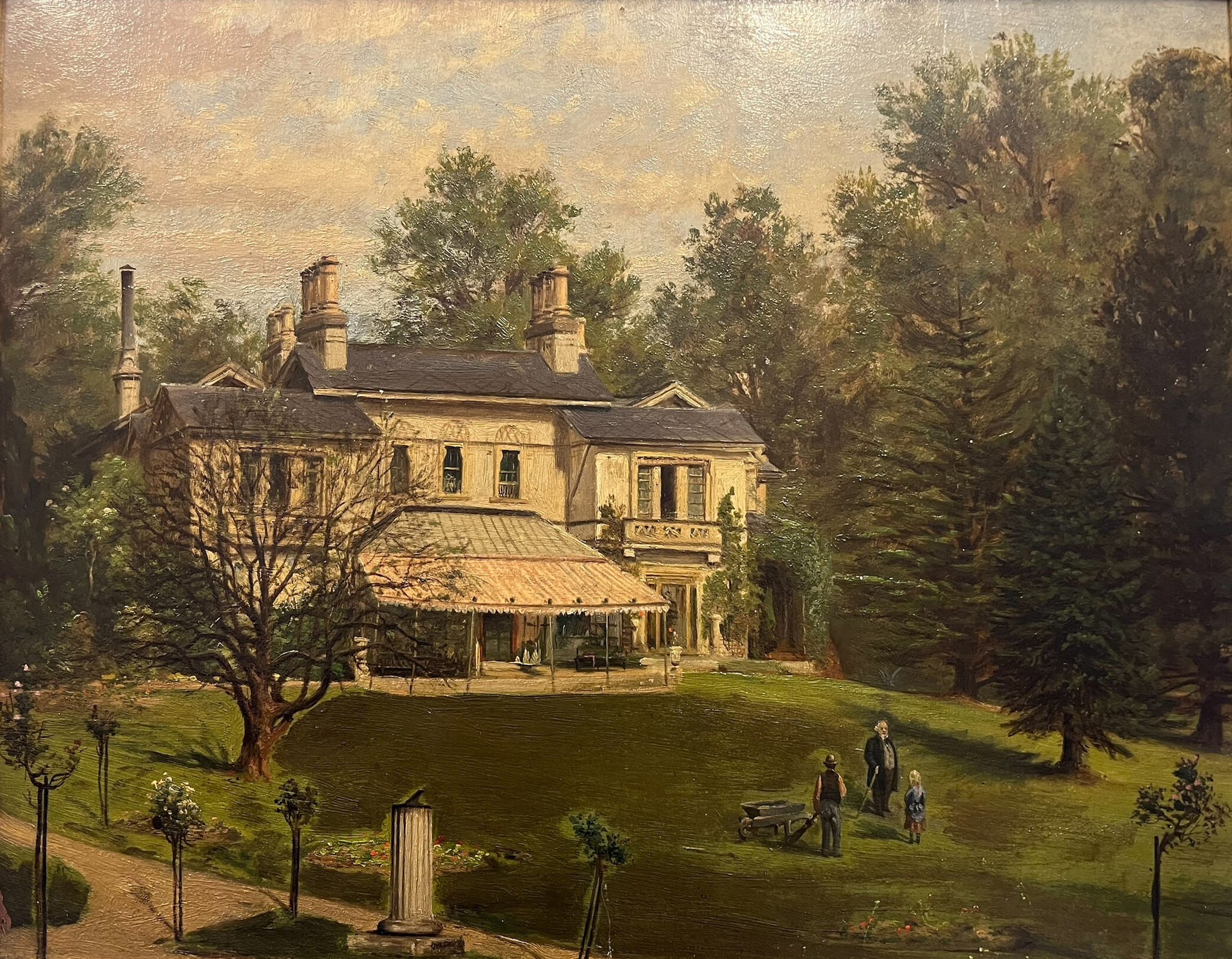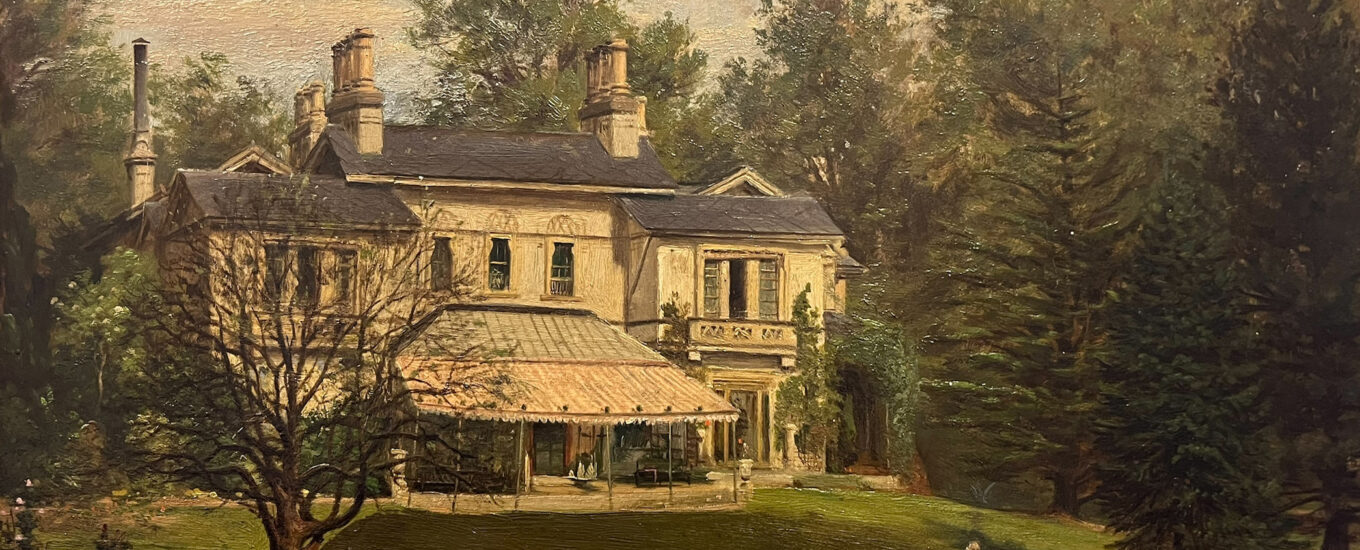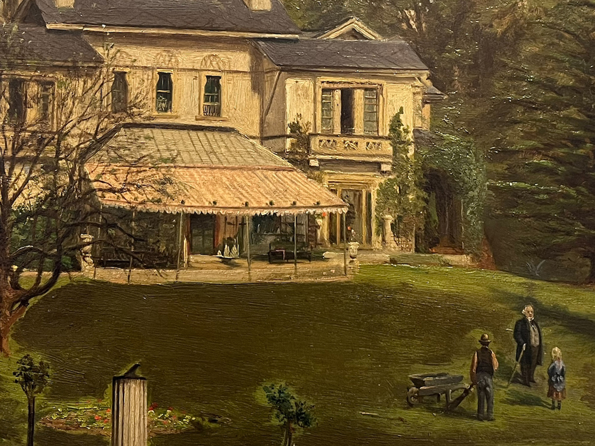 In January the Garden Museum purchased a late 19th century painting ‘Country House and Veranda with Figures’ from auction for the collection with funds from our Ever Green Endowment Fund. It depicts a fine house viewed from the garden and illustrates a gardener, a little girl and a man, possibly the owner of the house conversing on the lawn.