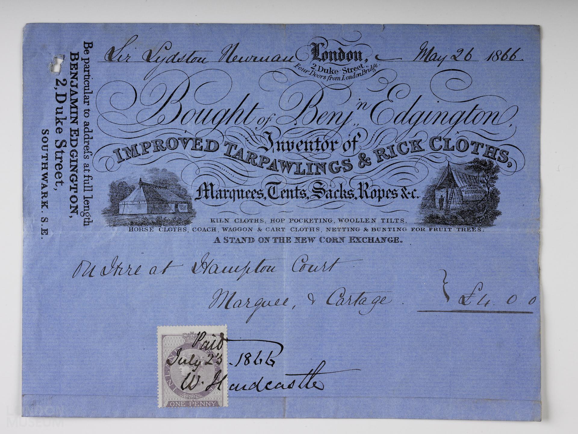 A bill dated May 1866 in London Museum’s collection from Benjamin Edington, Southwark notes that they were inventors of improved ‘tarpawlings [sic] and rick cloths, marquees, tents, sacks and ropes’. It is illustrated with examples of their merchandise.