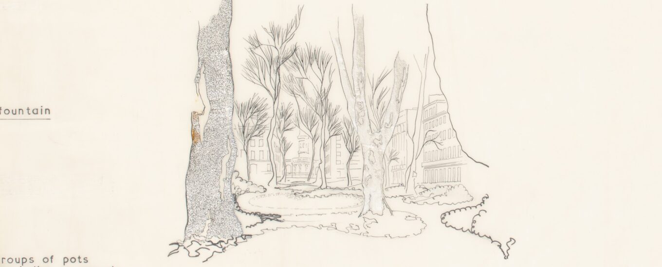 John Brookes MBE (1933 – 2018) was a garden designer, writer and lecturer who brought abstract and modernist principles to garden design. Beginning in the late 1950s, he designed thousands of gardens during his lifetime and generously deposited his archive of drawings to the Garden Museum in 2014. These drawings, often the only records for gardens that have since changed or disappeared, provide evidence of his design approach and vision. Brookes espoused the concept that when designing a garden, the principal factor to consider is how its occupants will use it. While this sounds very obvious now, at the time this contrasted with the grand garden traditions which were high maintenance, expensive and for show. This concept was reflected in his influential book, Room Outside (1969), where he argues that gardens should be an extension of modern living. As with the interior of the house, Brookes proposed that the garden should be a place for people to use, not just to look out at. An interesting project within the archive is Bryanston Square, a classic early 19th-century square in Marylebone, London. In 1964 Brookes moved to a mews nearby and was commissioned to give residents something interesting to look at from their first-floor reception rooms. Dr. Barbara Simms expertly summarises the history of the commission and analyses Brookes’ design approach in her monograph, John Brookes: Garden and Landscape Designer (Conrad Octopus, 2006).