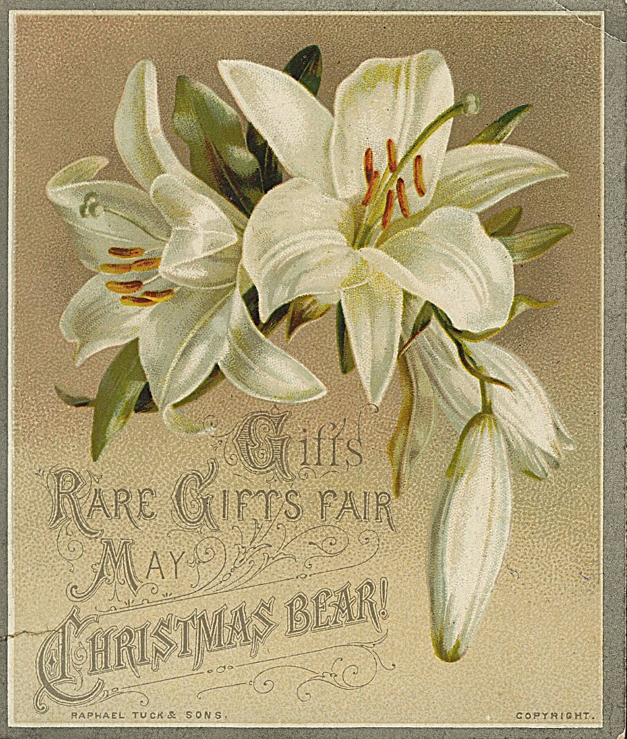 Although taken for granted today, the sending of Christmas cards had only been common for about a decade when these cards were produced (helped by the introduction of the halfpenny postage rate on postcards in 1870). Archive Volunteer Chris Barry shares my enthusiasm for the cards, and the card with a lily motif is particularly special for her, as it evokes memories of her childhood Christmases in New Zealand. A lily might seem like a strange choice for a British Christmas card, but flowers were popular choices for Nineteenth Century cards, partly because of the Victorian passion for floriography and collating scrapbooks of flowers. The fact that the first Christmas cards were often produced by Valentine’s card manufacturers also explains this romantic imagery, as well as the poems which often adorn the front of the cards. In the second part of this blog Chris tells us why the lily is an enduring symbol of Christmas for her.