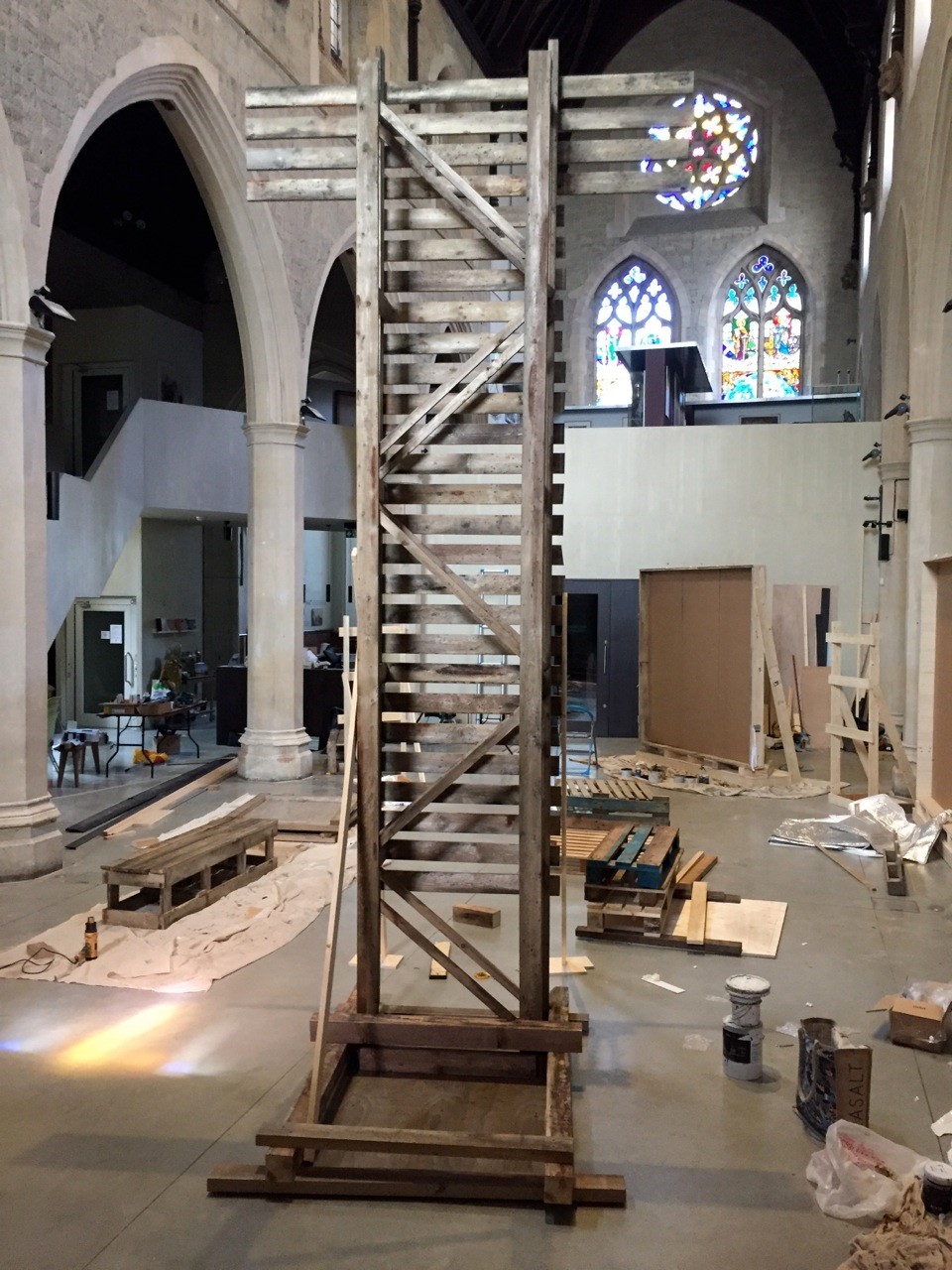 Dungeness navigation tower being built in the Garden Museum Nave, image courtesy of Jeremy Herbert