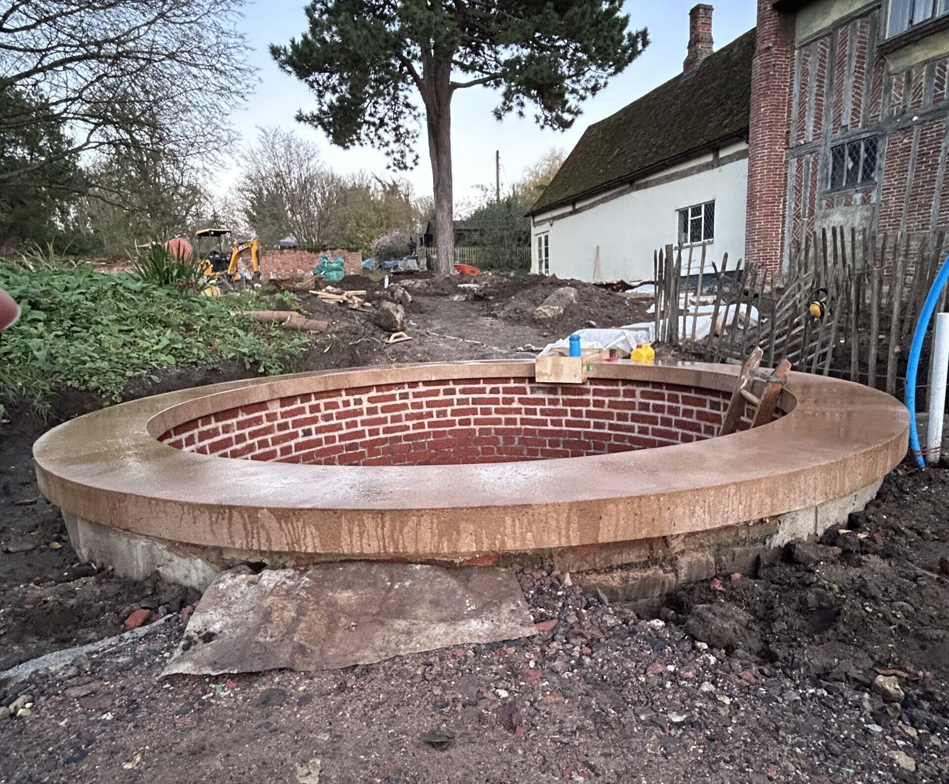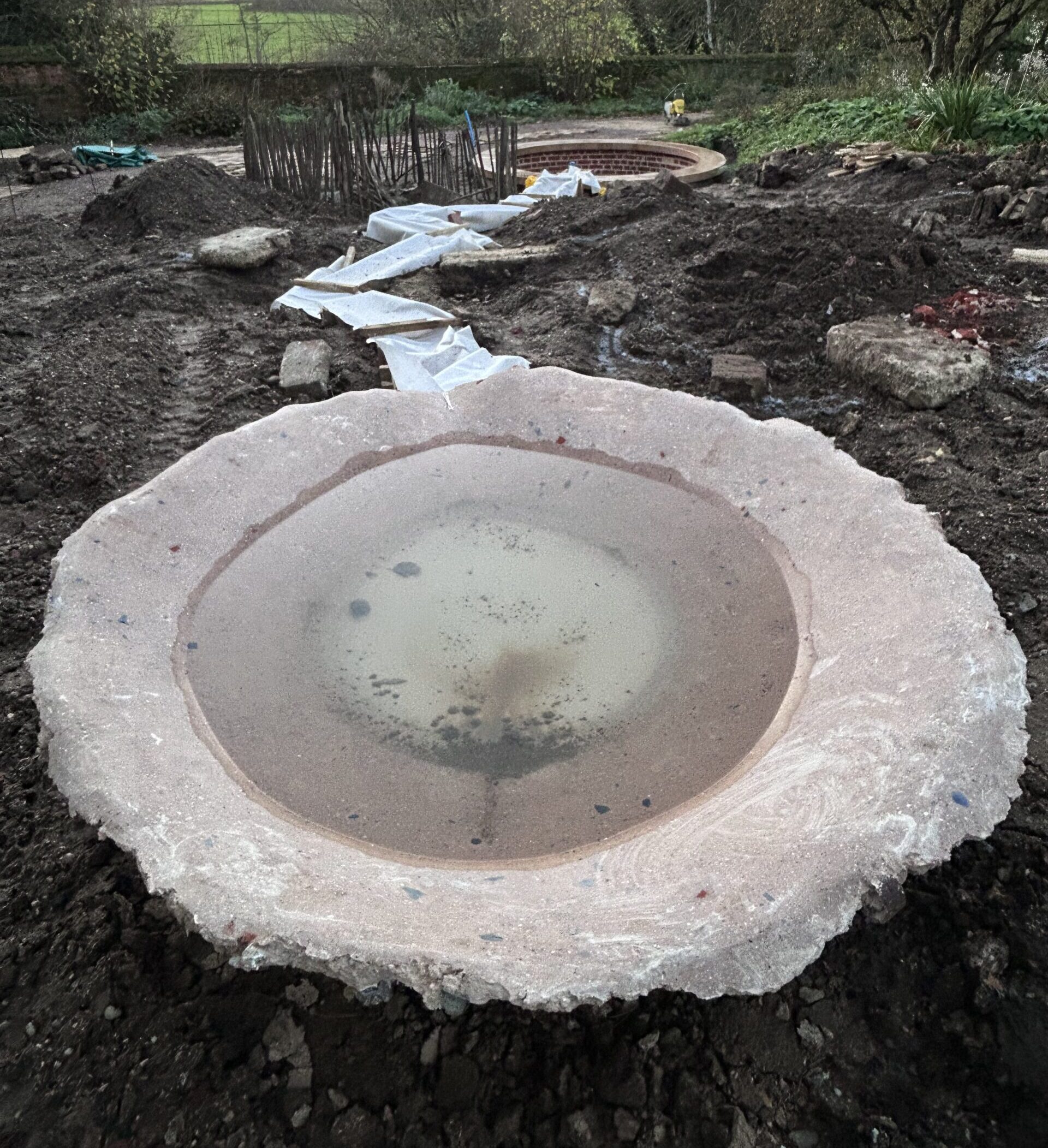 A water bowl has been cast, in-situ, which will be fed by the downpipes on the house as well as by the falling rain! It will empty into a specially-made rill, the forma for which was built last week and the first pour into which has just taken place. The rill runs gently down the natural slope of the garden and into the pond – refreshed with new pointing and sealant and looking very smart with its new coping, of course cast in-situ using a custom-built forma.
