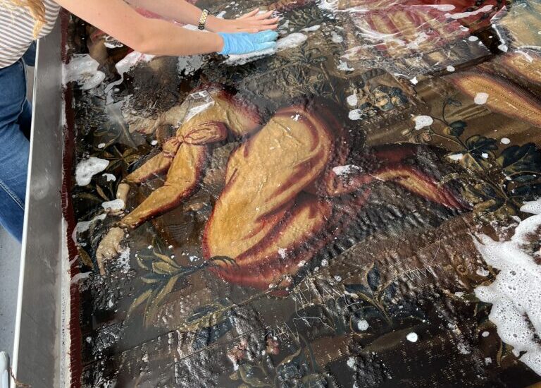 The tapestry was laid out in a large, flat wash bath, initially face up to soak in water. Delicate areas of the tapestry had netting stitched over them to protect them during washing. Water was added with a very diluted detergent and then sponges were used to gently work over the surface of the tapestry. The water was drained and sampled to see how much cleaner the tapestry was becoming. The level of detergent in the water was decreased in subsequent washes.