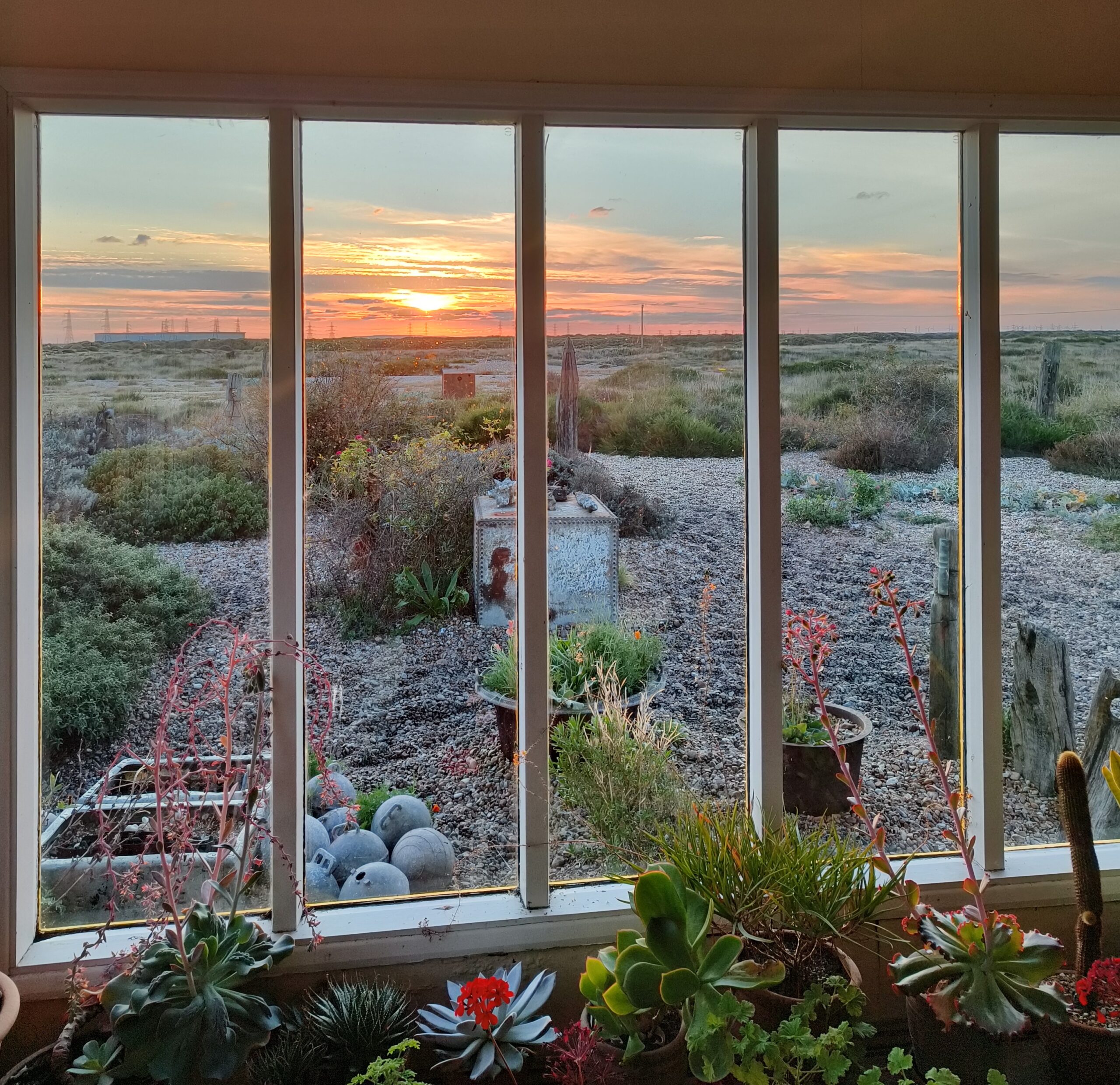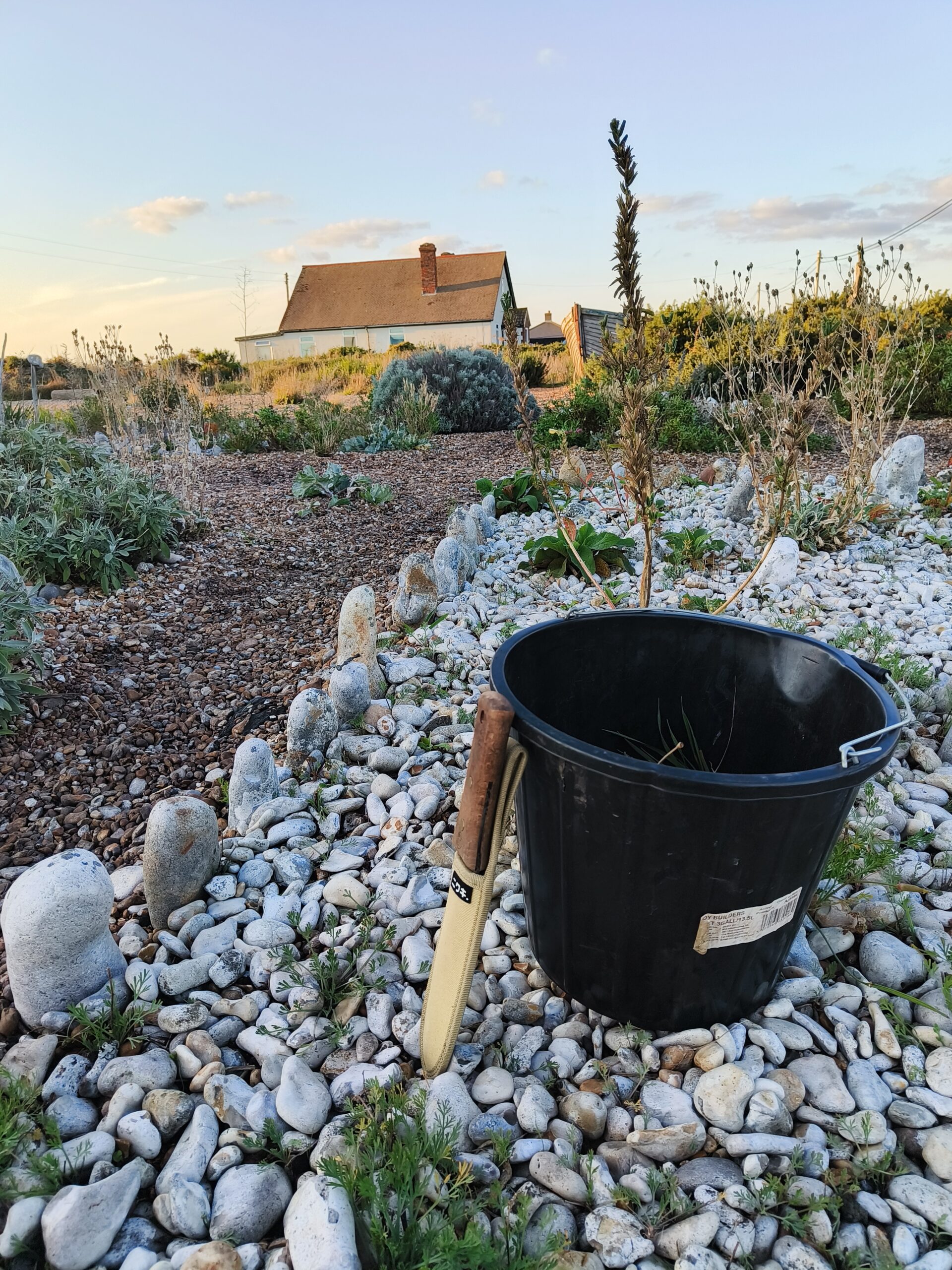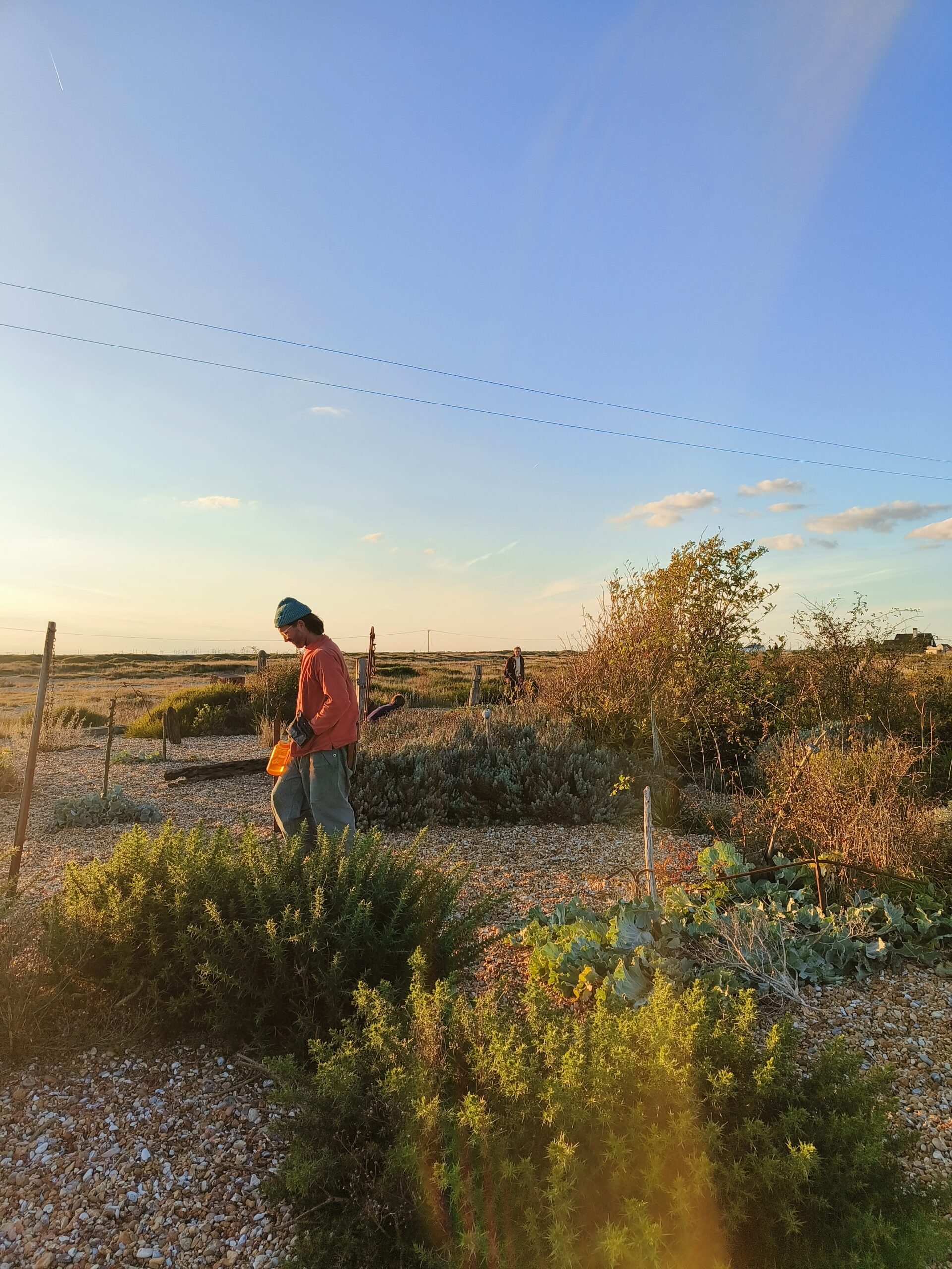 On an early autumnal weekend, the sun casts a shadow on the dragon teeth across the shingle, glowing strong as it sets over us gardening at Prospect Cottage. Kindly invited by Prospect’s gardener Jonny Bruce, I was here to join several others for a working weekend in Dungeness. Wrapped in a thick woollen jumper, I came here to nestle closer to Derek Jarman and his garden, but what I learnt out on the exposed shingle was that this was now a collectively tended space, full of the care and collaboration of so many hands.