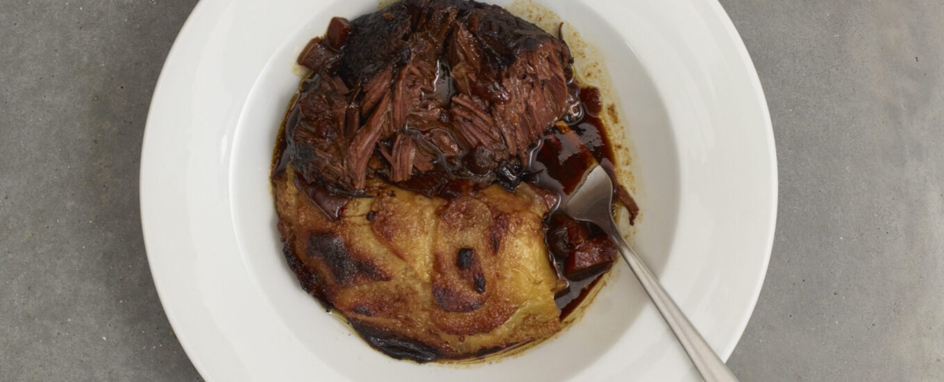 The Garden Café: A Year in the Kitchen is a new cookbook written by Garden Café head chef George Ryle, a small collection of some of the dishes that he has most enjoyed cooking and serving at the Garden Museum. With recipes selected from each of the seasons, the book is a journey through a year in our kitchen. To celebrate the release of the book, we’re sharing a sneak peek inside with this recipe from the Winter chapter! George’s pro tip: “if you don’t want to hate me, yourself, or this recipe, then make sure you give yourself plenty of time to prepare and cook this.” Jansson’s temptation doesn’t sound like food really, does it? But food it is, and pretty spectacular food at that. If you haven’t tried it before then prepare yourself for fireworks. It’s a really, really good thing. It’s a Swedish potato dish, similar, in theory, to potato dauphinoise but unique in the addition of lots of sweet onions and, even more importantly, a hell of a lot of anchovies. It works so, so well – I’m tempted to say better than the sum of its parts, such is its excellence, however as I think about it I realise that its parts are all excellent: cream, potatoes, onion, and anchovies. Perhaps equal to the sum of its parts would be more apt. It just so happens to be the perfect accompaniment to rich, unctuous beef cheeks, slowly braised in red wine and beef stock. It is, however, a dish that should probably not be eaten too many times in a week, or even a month, but it is the perfect family dinner on a Sunday night in the depths of winter. A salad of winter leaves, the colourful bitter ones from northern Italy, might make a welcome addition. Cheeks, it must be mentioned, are good pretty much wherever they come from, beef or pig, cod or monkfish, it’s a great muscle to eat. Here it is beef that waves the flag for the gloriousness of cheeks – braised in wine and stock, to the point where a spoon is all that is required to split them in half (that’s a satisfying moment). This is a crowd-pleaser, plain and simple.