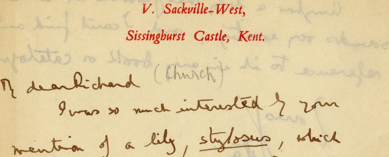 Despite the difficulties of the past year, the Museum has still been actively acquiring new material to enhance the Collection. When Garden Designer Paul Bangay alerted us to a Vita Sackville-West letter coming up for auction, offering to help us acquire it, we couldn’t resist. Even more enticingly, the letter was about an unusual lily. As it happened, the lucky person with the winning bid offered to donate the letter to the Museum – and more. This one letter opened up a whole story; there was another poet and garden-lover living within the grounds of Sissinghurst Castle, just a few steps from the main house – Richard Church. We are very grateful to Andy Moreton for his generosity, and would like to share some highlights from his gift here. Richard Church (1893-1972) was a poet, writer and critic whose love of the English countryside was evident in much of his work. He was born in Battersea into modest beginnings; his father was a postal worker and his mother a schoolteacher. He left Dulwich Hamlet School aged 16 due to economic necessity and joined the civil service, but wrote poetry assiduously in his spare time. Although his first book of poems, The Flood of Life, was published in 1917, Church carried on working for the Civil Service until 1933, 24 years altogether, until he’d built up a literary reputation that could sustain him as a full-time writer. The most acclaimed of his novels, The Porch (1937), drew on his experiences of working in the civil service. It was awarded the Femina Vie Heureuse Prize. Perhaps the most enduring of Church’s publications, though, was his three part autobiography: Over the Bridge received the Sunday Times Prize for Literature in 1955, The Golden Sovereign led to him being awarded a CBE in 1957, and the final volume, The Voyage Home, was published in 1964. For the last four years of his life, Church lived within the grounds of Sissinghurst, home of the famous poet, writer and gardener Vita Sackville-West (1892-1962) and her husband Harold Nicolson (1886-1968). Church lived, fittingly, in the Priest’s house, which can be seen to the far right in the photograph below.