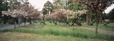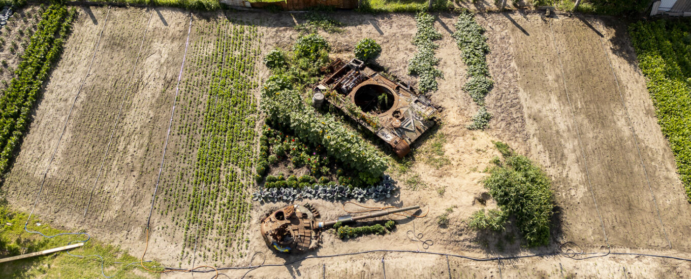 At the height of the war around Kyiv in 2022, photographer Sergii Polezhaka began documenting war-torn gardens – an abandoned tank amid neat rows of vegetables; cherry blossom trees with trenches dug around their roots to preserve them; a tended rose garden beside a bombed ruin.