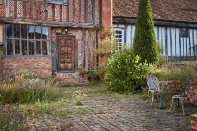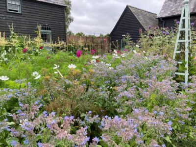 One of the highlights is the formal vegetable garden adjoining an 18th Century timber-framed barn. It was created on the site of a partially demolished modern farm building whose brick walls were left standing to enclose a walled garden.