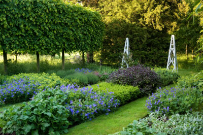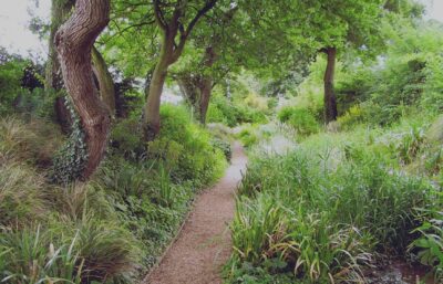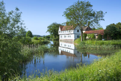 Outside the moated area, the mood is natural and understated. Cow parsley is allowed to run riot on the moat banks, and there is a bog garden with a stream and waterfall, a series of  ponds and orchards. A grassy walk through woodland “completes itself,” in the words of Catherine Howard, writing in Essential Suffolk, “with the Moat Walk and the house seen from its really knockout side, reflected upside down even on an overcast day.”