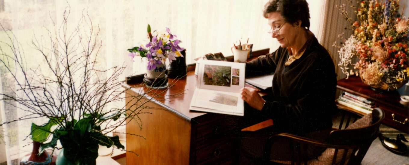 A wide view of one of the beds at the Beth Chatto Gardens, taken in 1998. Her deliberate grouping of different plant forms and textures provides structure and interest. Although her later focus was on the garden, flower arranging remained a source of pleasure throughout Beth’s life. The archive has mentions of the arrangements she made for her own home and those of her friends, such as Christopher Lloyd at Great Dixter, and Countess Helen von Stein Zeppelin who asked for her help in decorating for her 80th birthday celebrations.